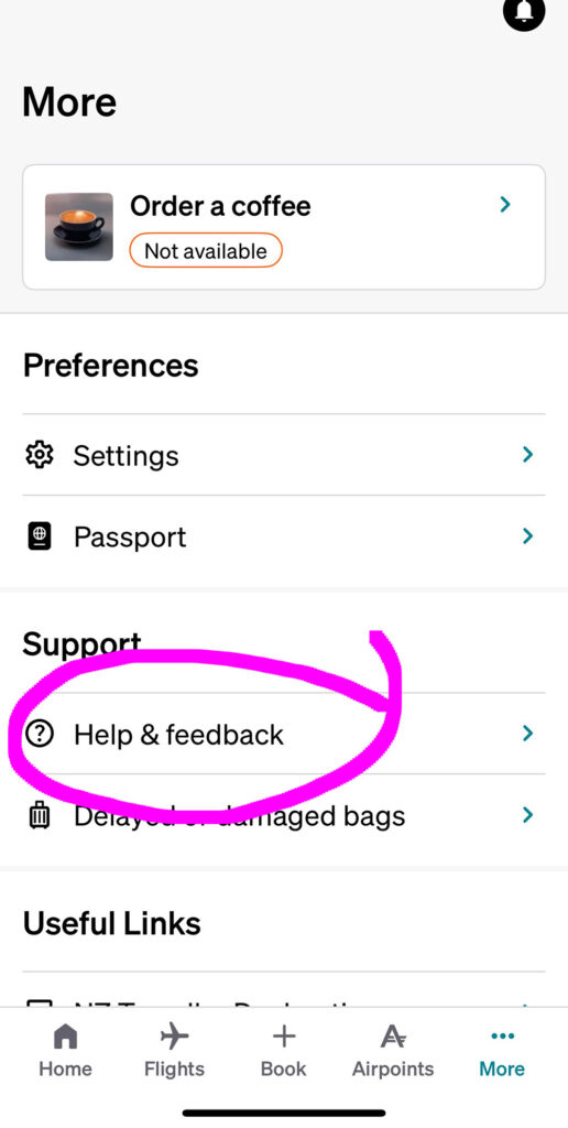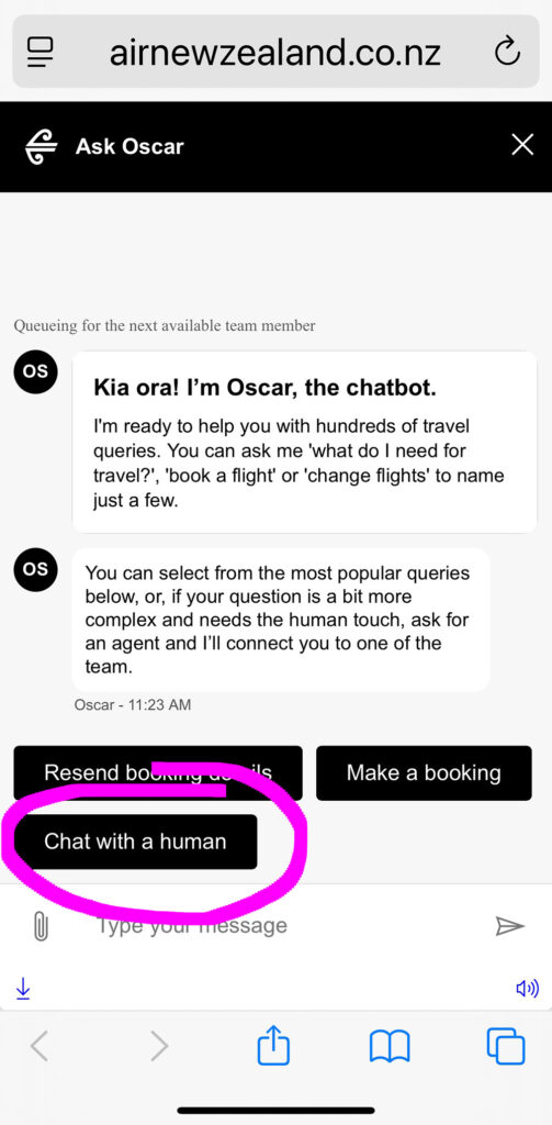 I tapped ‘Chat with a Human’. Andy typed back almost immediately. I explained the above and asked if there was a seat on any other flight heading to Napier that day.